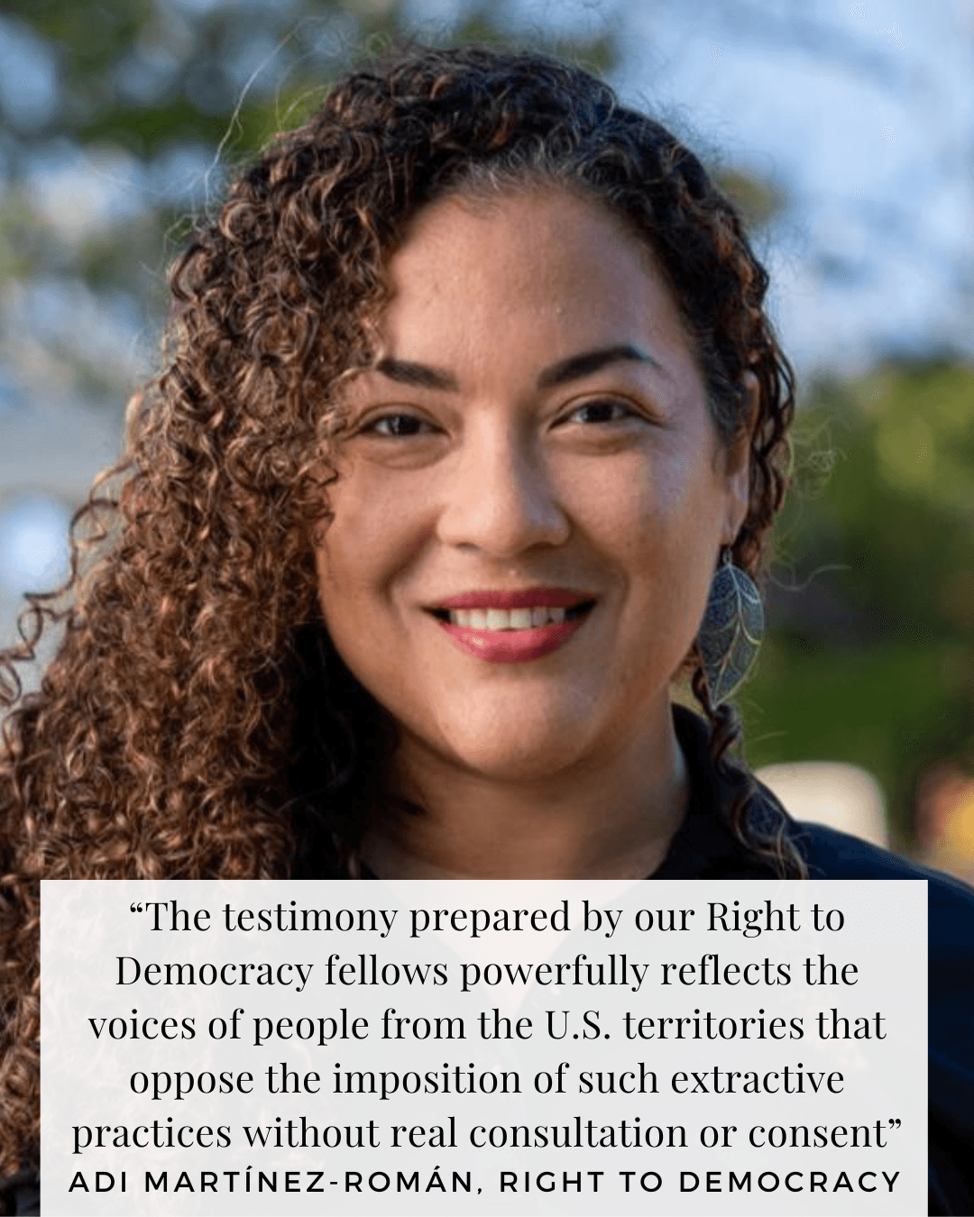 The movement is also driven by a commitment to democratic participation. As Adi Martínez-Román, co-director of Right to Democracy, emphasized after the congressional hearing, “We worked to make sure that voices from the territories were heard… which powerfully reflects the voices of people from the U.S. territories that oppose the imposition of such extractive practices without real consultation or consent.”