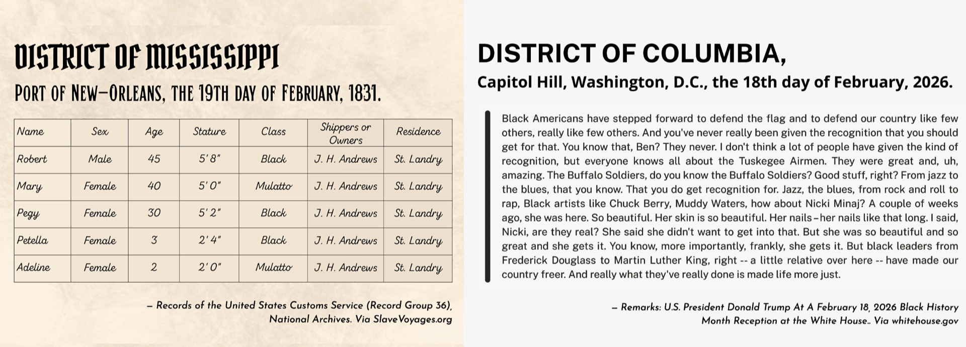 Twenty-four hours before the 195th anniversary of Adeline and Pegy being loaded onto the Schooner Nelson, inventoried as cargo, and shipped from the port of New Orleans, the 47th President of the United States took the stage at a White House Black History Month reception.